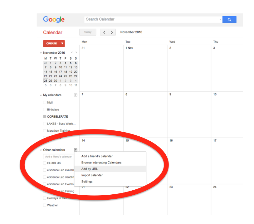 In the left-hand column of the Google Calendar main view, click the arrow to the right of "Other calendars" and click "Add by URL". In the form that appears, paste in the URL from the box above, and click the button to confirm.